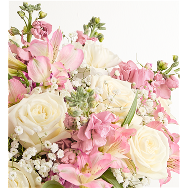 • All-around arrangement with white roses and carnations, pink Peruvian lilies (alstroemeria) and stock; accented with baby’s breath and assorted greenery